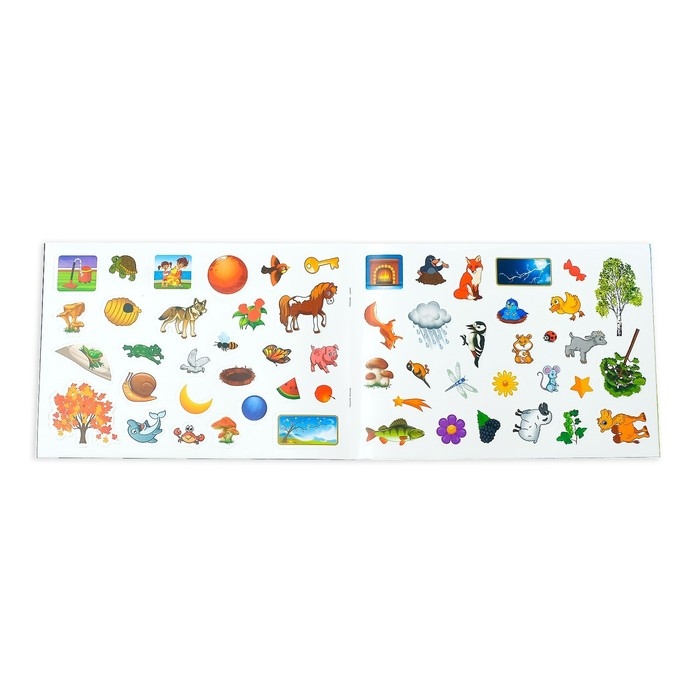 В альбоме представлено более 100 наклеек с красочными изображениями зверей, насекомых, фруктов и грибов. Яркие картинки тренируют визуальное восприятие малыша, память и воображение.