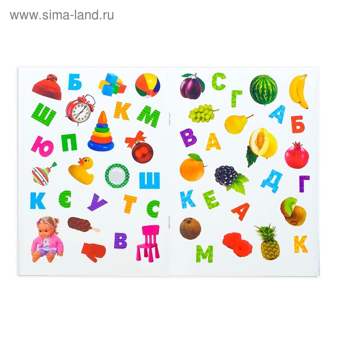 В альбоме представлено 111 наклеек с красочными изображениями животных, растений, букв, фруктов, овощей и других важных предметов окружающего мира. Яркие картинки положительно влияют на визуальное восприятие малыша, память и воображение.