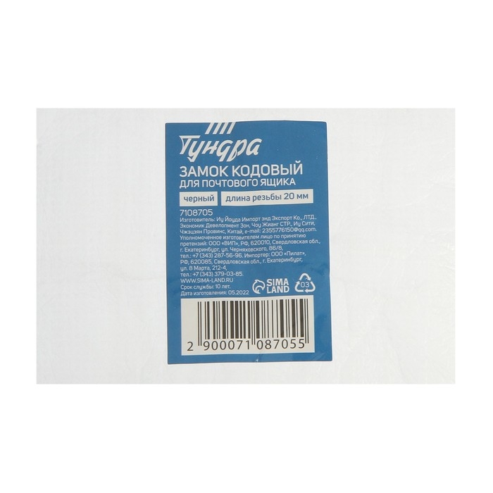 Замок кодовый ТУНДРА, для почтового ящика, цвет черный, длина резьбовой части 20 мм