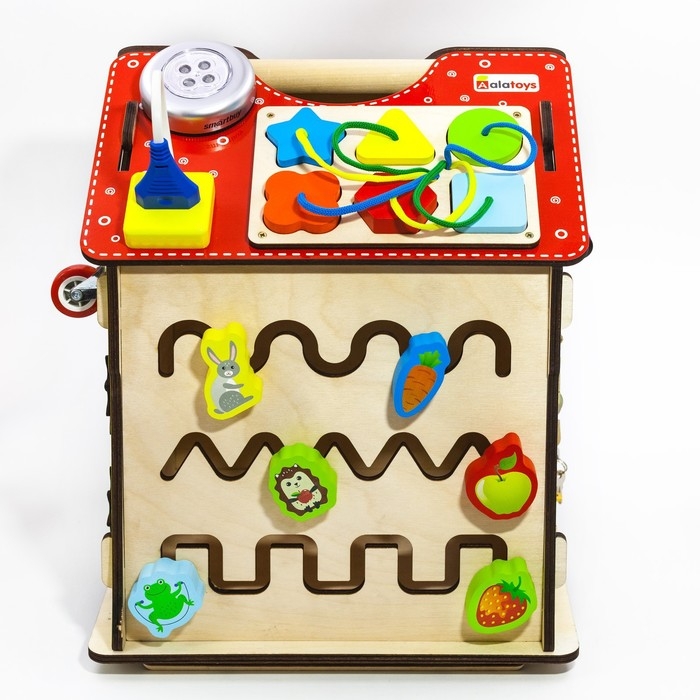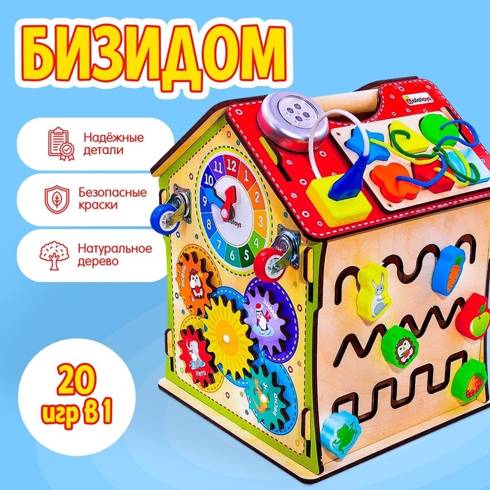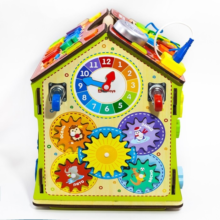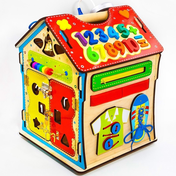 - Многофункциональность: на стенах бизидома вы увидите разнообразные лабиринты, колесики, шестеренки, циферблат со стрелками, колокольчик, дверцы с разнообразными замками, молнии и шнуровки. На крыше дома вы увидите сортер с разноцветными цифрами и геометрическими фигурами, розетку и светильник.
