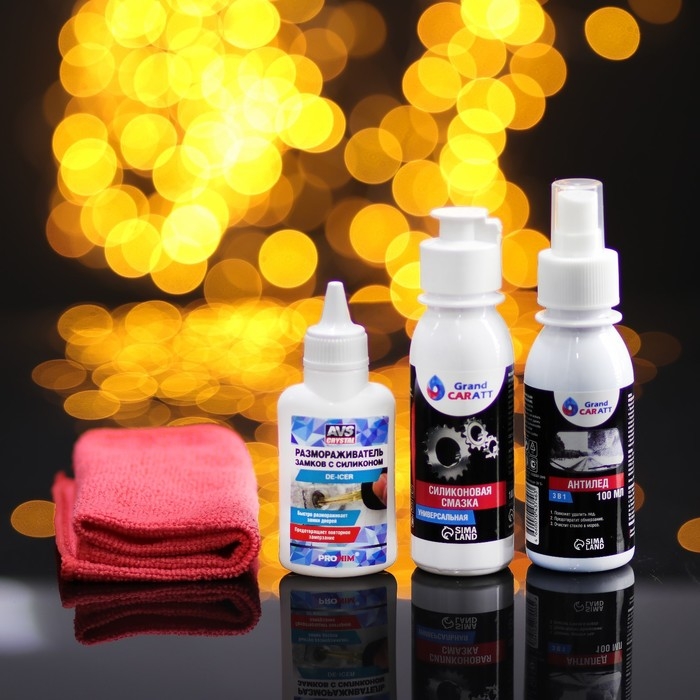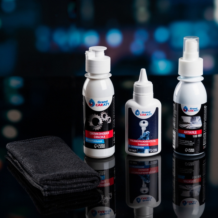 Подарочный набор автолюбителю Grand Caratt black, Зимний спасатель: размораживатель замков 50 мл, Антилёд 100 мл, силиконовая смазка 100 мл, микрофибра