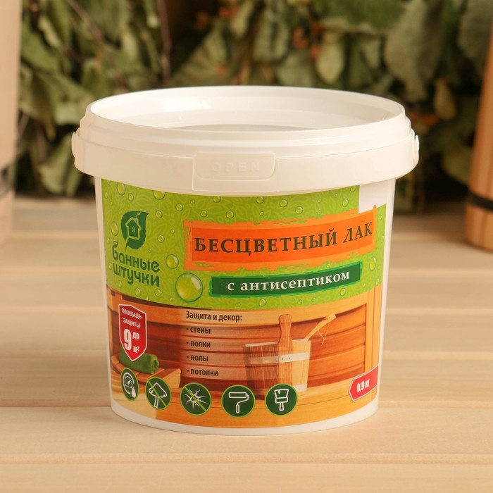 Лак бесцветный, для защиты и декоративной отделки деревянных поверхностей в бане и сауне 0,9