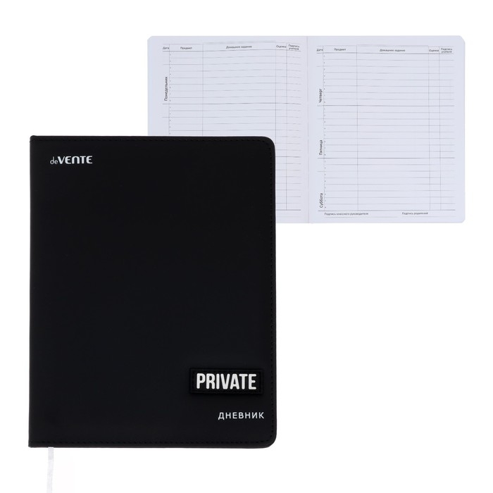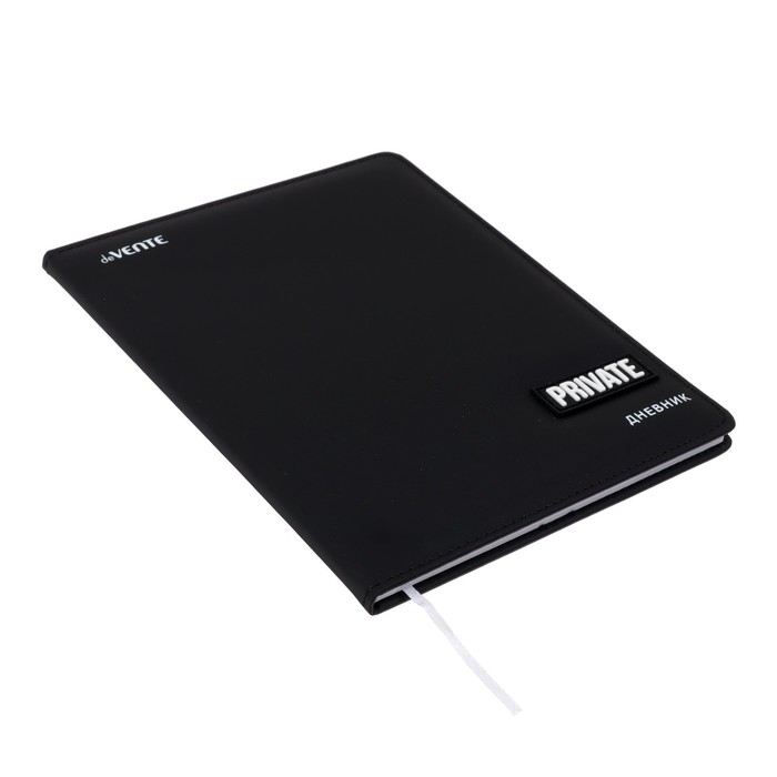 Дневник "deVENTE. Private" универсальный блок, офсет 1 краска, белая бумага 80 г/м², твердая обложка из искусственной кожи с поролоном, шелкография, цветная объемная аппликация rubber patch, отстрочка, 1 ляссе