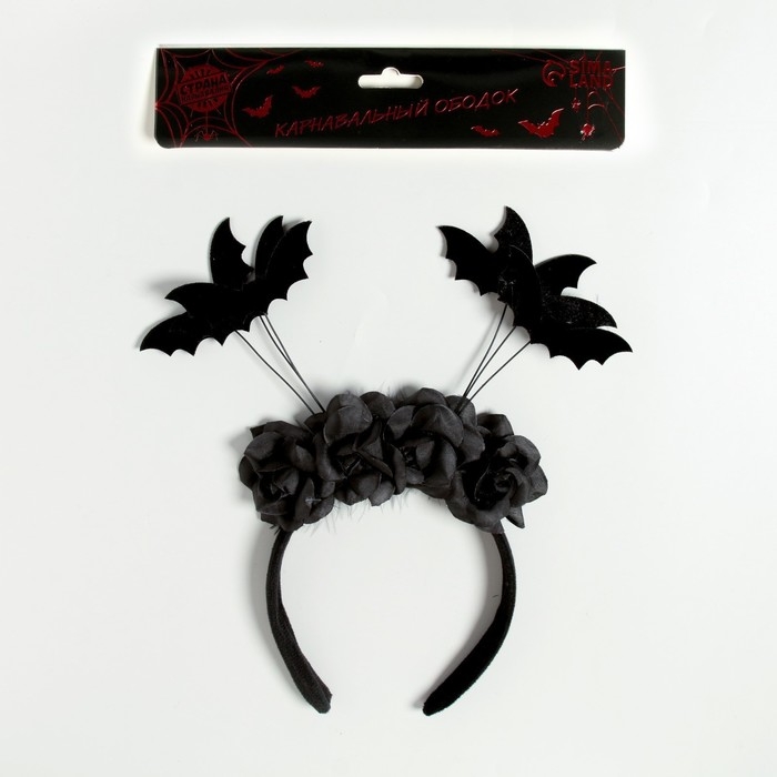 Карнавальный ободок «Летучие мышки» — это оригинальный аксессуар для создания яркого и запоминающегося образа. Чёрные летучие мыши с цветами привлекут внимание всех окружающих.