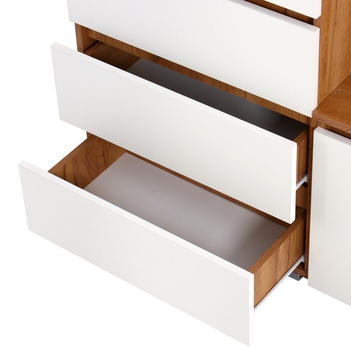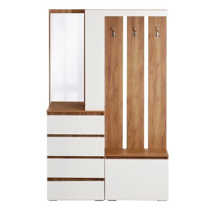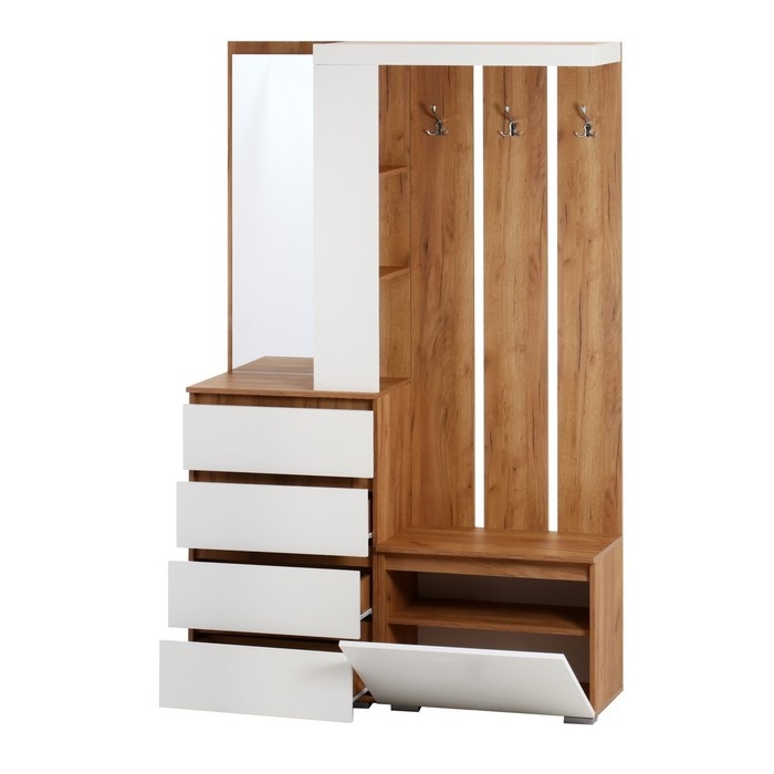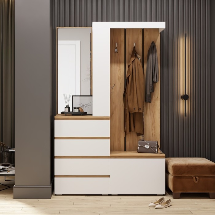 - Дизайн прихожей, сочетает в себе два основных цвета: белый и дуб золотой.