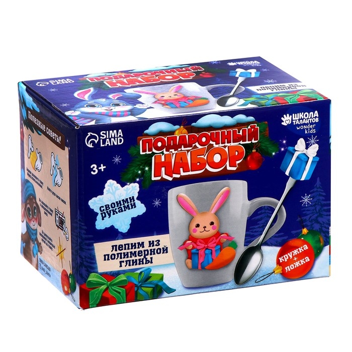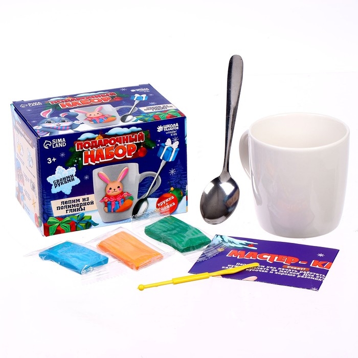 Декор кружки и ложки полимерной глиной на новый год «Зайка и подарок», новогодний набор для творчества