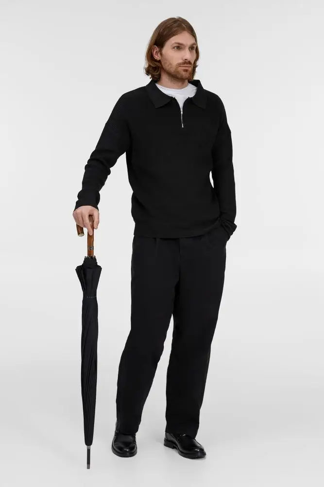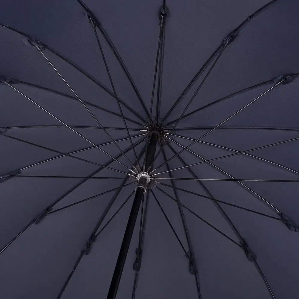 Солидный изысканный зонт с ручкой из дерева и 16 спицами. Большой купол легко укроет от дождя сразу двоих, а надежная конструкция выдержит даже сильный ветер.