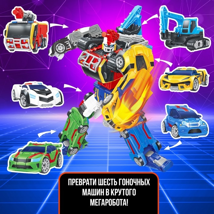 Из глубин космоса по заоблачным маршрутам на нашу планету прибыл невероятный гость — «Мегаробот». Главная особенность — в случае опасности этот робот способен разделиться на 6 уникальных машинок!