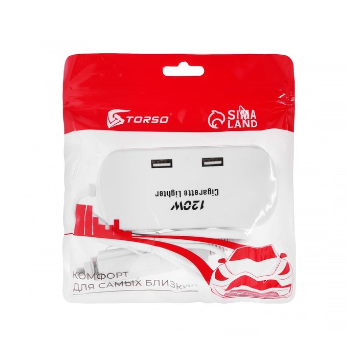 Разветвитель прикуривателя TORSO, 12-24 В, USB 2А, провод 40 см