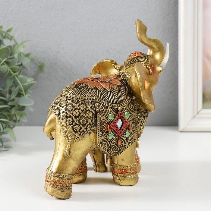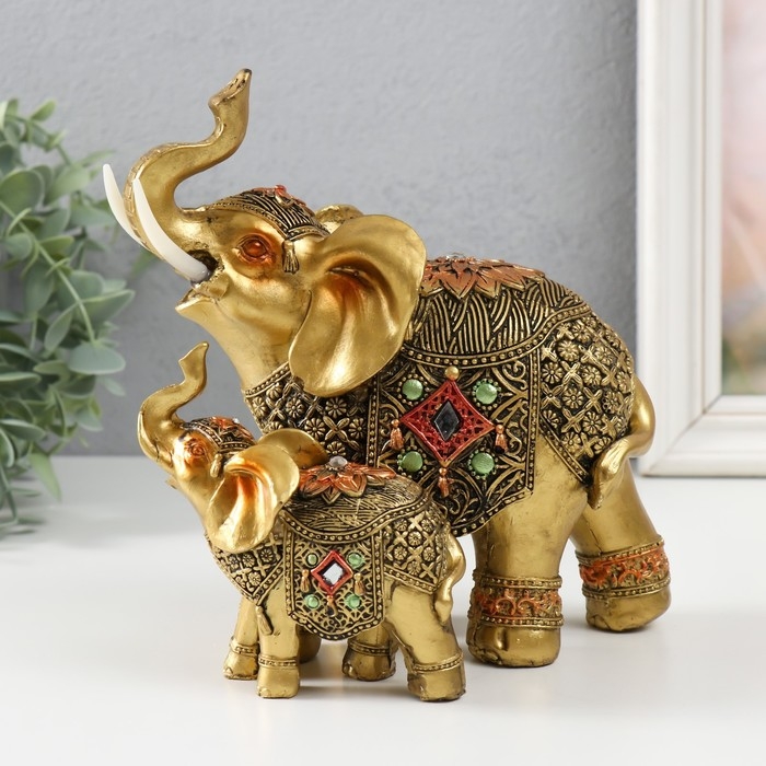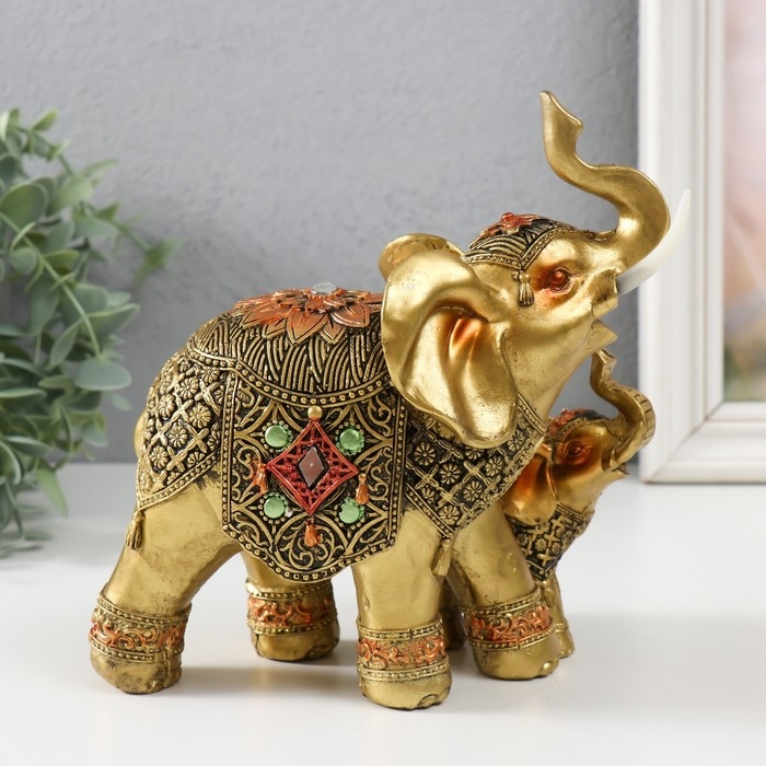Сувенир полистоун "Слониха и слонёнок в попоне с цветком" бронза 15х12,5х17,5 см