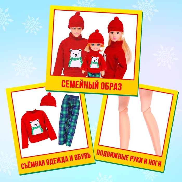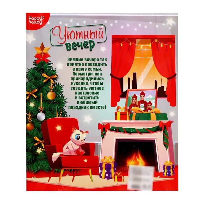 Семья кукол проводит уютный вечер вместе! Малышка сможет поиграть в новогодний праздник или придумать другие сюжеты с куклами.