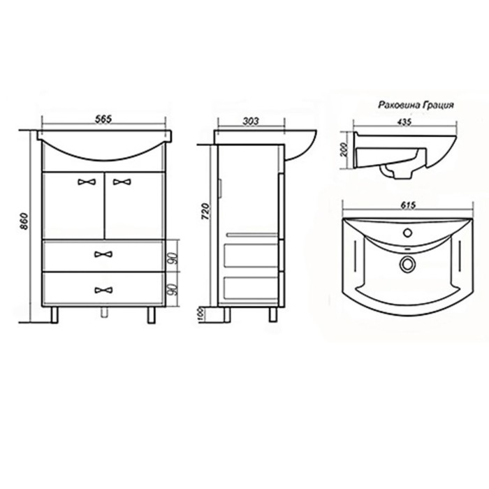 Комплект мебели для ванной: Тумба "Белла 60/2" + раковина "Грация", 60 х 43,3 х 82 см