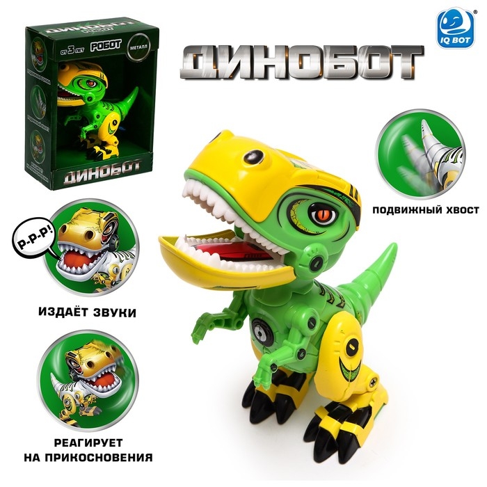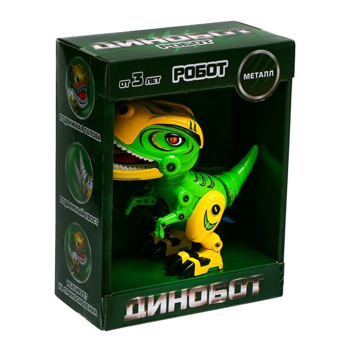 Робот динозавр «Динобот», интерактивный: реагирует на касания, световые и звуковые эффекты, на батарейках, зелёный