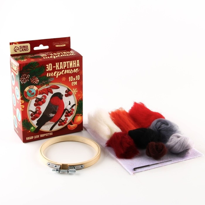 Валяние из шерсти на новый год. Живопись шерстью на пяльцах «Снегирь на рябине», 10 × 10 см