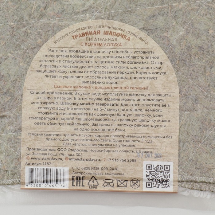 Травяная шапочка для бани "Питательная"