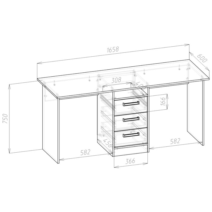 - Расстояние между опорой и центральными ящиками стола: 582 мм.