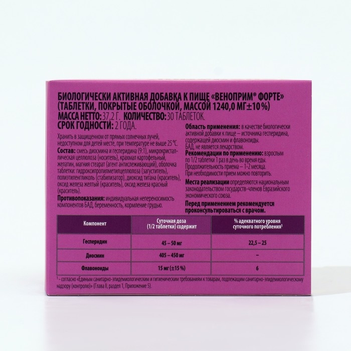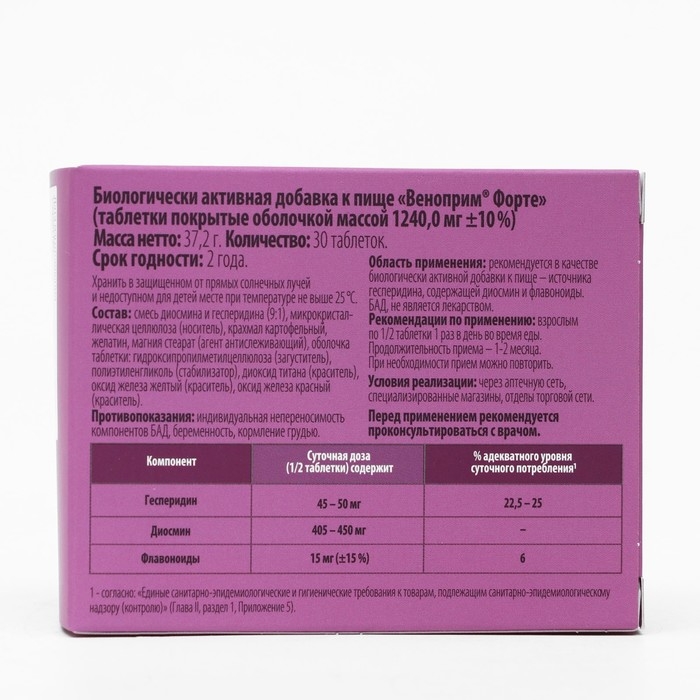 «Веноприм® Форте» – биологически активная добавка к пище, состоящая из гесперидина с диосмином и флавоноидами, которые способствуют нормализации функционального состояния вен, уменьшению степени выраженности отеков, повышению тонуса сосудов и уменьшению чувства тяжести в ногах.