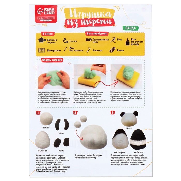 В этом наборе собрано всё самое необходимое для создания своими руками игрушки в технике сухого валяния. Раньше чтобы смастерить что-то подобное приходилось искать шерсть разных цветов в магазине, у бабушки, в маминых коробочках с пряжей, а теперь всё необходимое есть в комплекте для творчества. Теперь каждый, даже начинающий любитель фелтинга, быстро смастерит красивую игрушку.