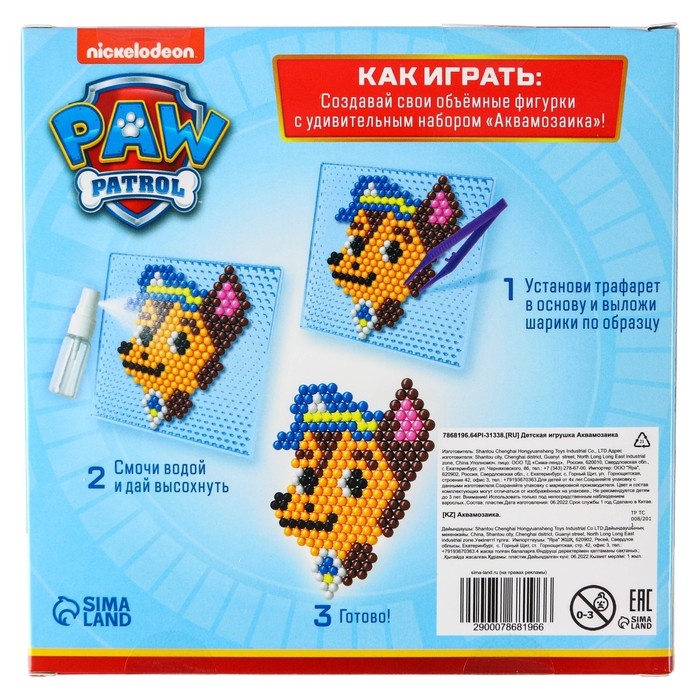 С аквамозаикой «Команда» ребёнок соберёт из шариков-пикселей 4 объёмных фигурки с персонажами популярного мультфильма «Щенячий патруль». С поделками можно играть или украсить интерьер.