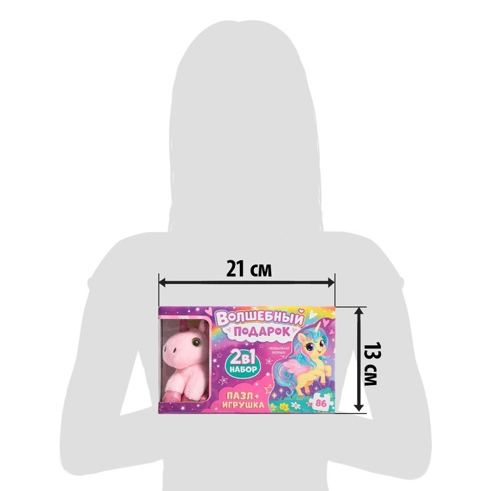Набор «Волшебный подарок» станет эффектным подарком на любой праздник! В наборе вы найдёте фигурный пазл из 86 деталей и мягкую игрушку.
