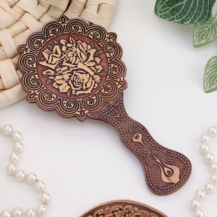 Зеркало «Цветы», с ручкой, хохлома, 16,5 х 9 см, береста
