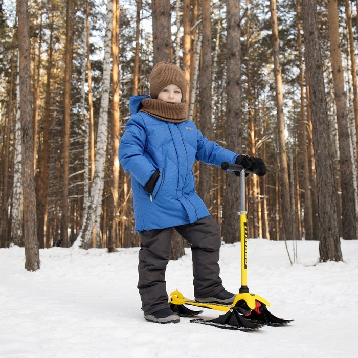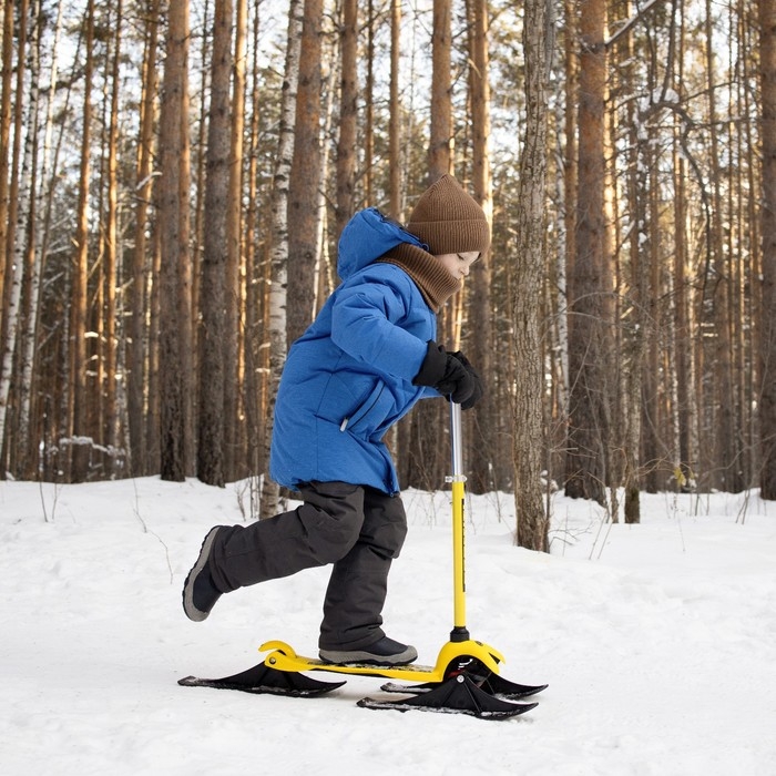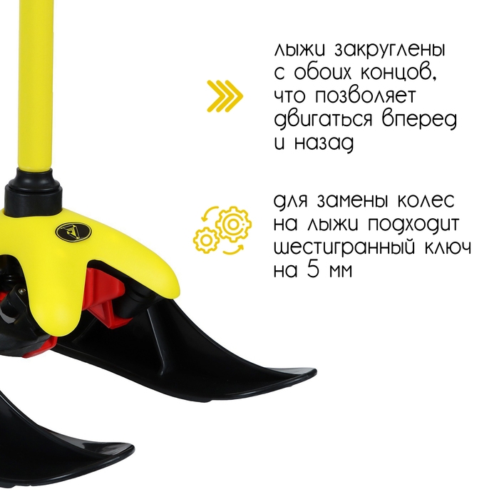 Самокат-снегокат актуален зимой и летом. На колёсах можно кататься по любым ровным поверхностям в сухое время года, зимой — на лыжах по снегу.