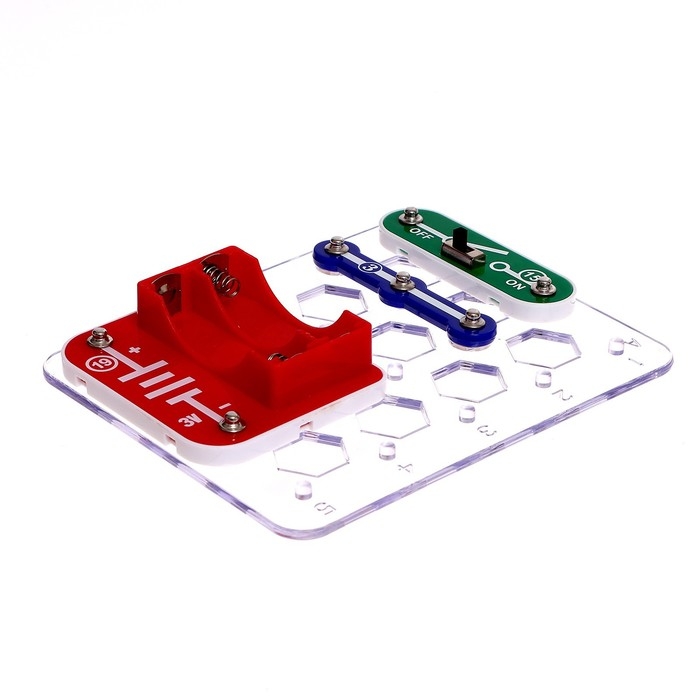 - В электронном конструкторе необходимо использовать батарейки 1,5 В. Такое напряжение безопасно для человека. Поэтому ребёнок сможет самостоятельно играть с набором, а вы — не переживать о его безопасности.