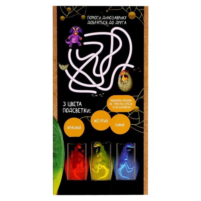 Ночник «Диномир» создаст уютную атмосферу в комнате ребёнка и позволит юному учёному познакомиться с термочувствительными материалами на примере изменения цвета фигурки динозавра при контакте с тёплой водой.