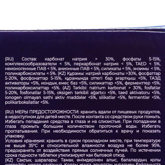 Состав: 5% кислородосодержащий отбеливатель, активатор таед, 5% неионогенные пав, фосфаты 5-15%, фосфонаты, силикаты, энзимы, поликарбоксилаты, ароматизатор, лимонен.