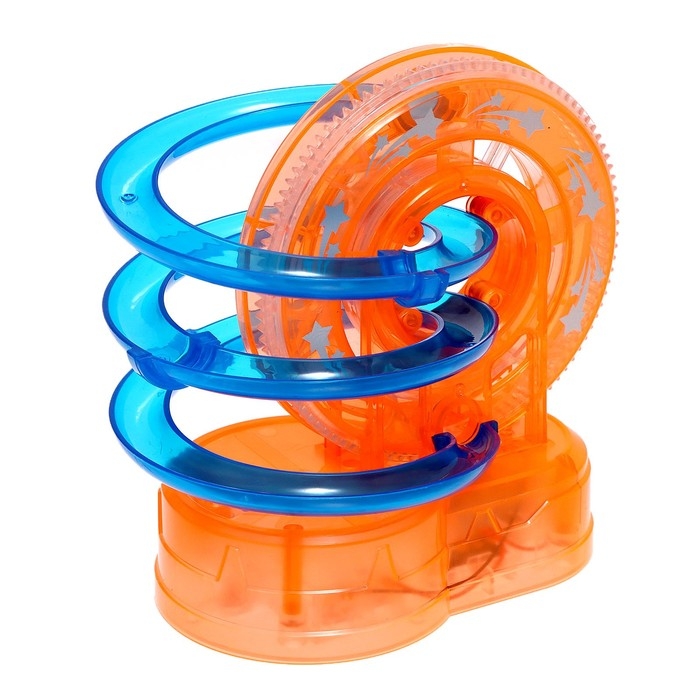 - В комплекте 4 шарика, которые будут подниматься по крутящемуся колесу и скатываться на спиральном спуске.