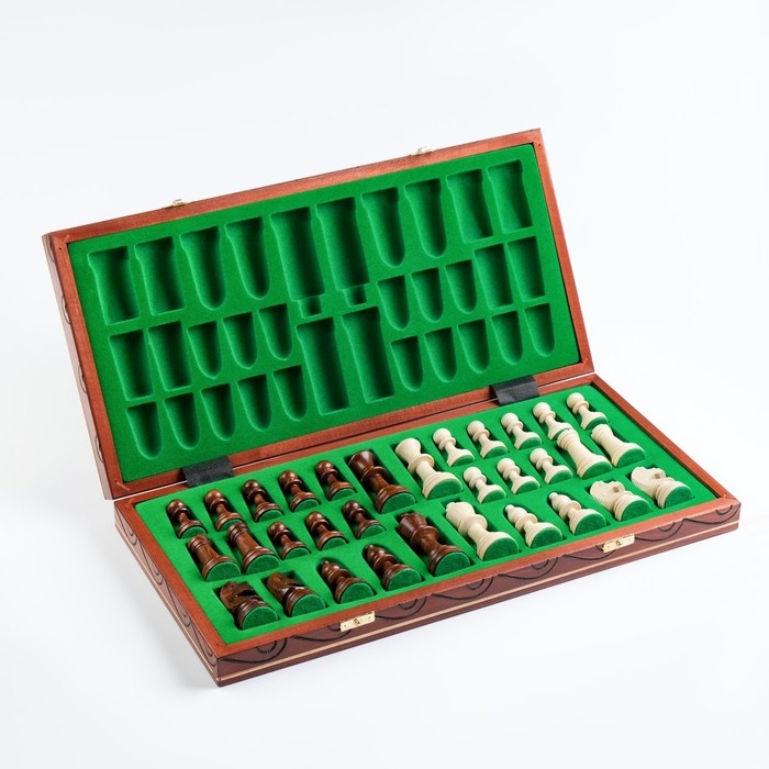 Наличие бархата зеленого цвета добавляет изыска изделию, а для удобного хранения шахматных фигур предусмотрены специальные отсеки, что обусловливает минимум передвижения при переноске.