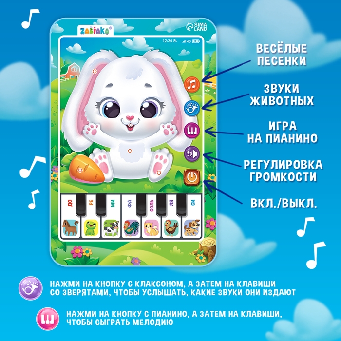 - Четыре режима игры: песенки, ноты, фразы и звуки животных.