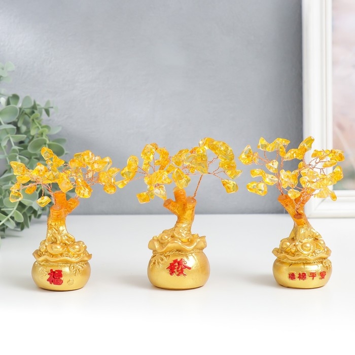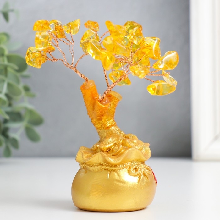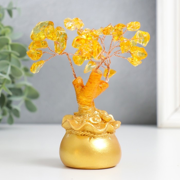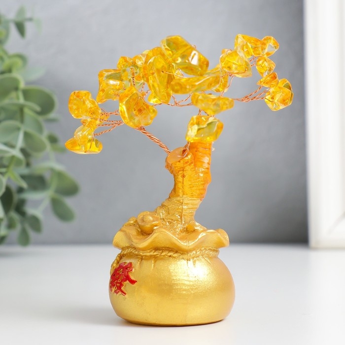 Сувенир бонсай "Денежное дерево с янтарём в золотом мешке" 36 камней МИКС 11,5х4,5х4,5 см