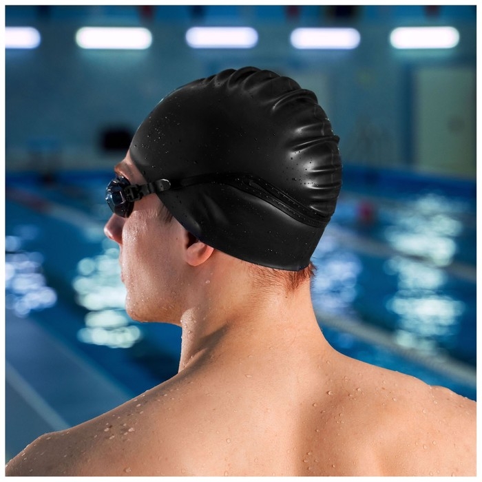 Шапочка выполнена из прочного силикона, надёжно защищает от намокания и не цепляет волосы. Длина обхвата: 54–60 см.