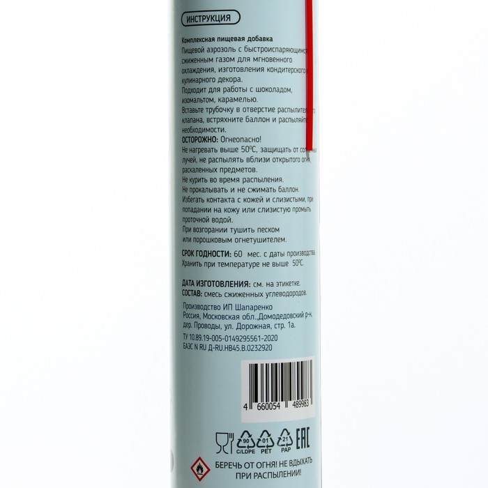 Пищевой аэрозоль с быстро испаряющимся сжиженным газом для мгновенного охлаждения. Подходит для изготовления кондитерского и кулинарного декора.