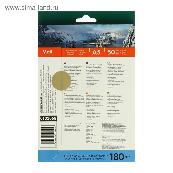 Фотобумага для струйной печати А5, 50 листов LOMOND, 180 г/м2, односторонняя, матовая