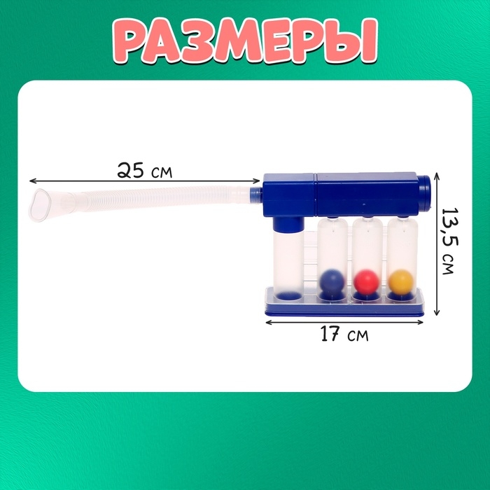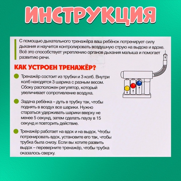 - Тренажёр состоит из трубки и 3 колб. Внутри колб находятся 3 шарика с разным весом. Сбоку расположен регулятор, который увеличивает сопротивление воздуха.
