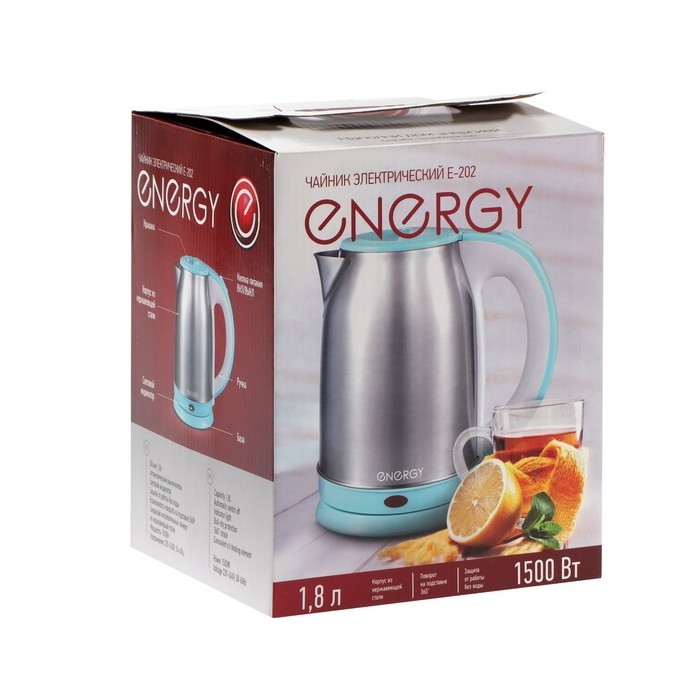 Чайник электрический ENERGY E-202, металл, 1,8 л, 1500 Вт, серебристо-голубой