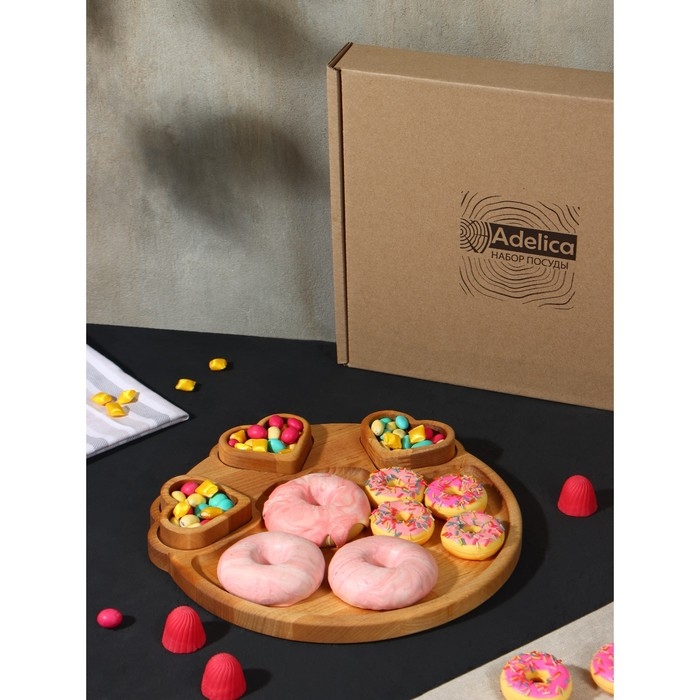 Подарочный набор деревянной посуды Adelica, доска сервировочная, менажница 5 секций, масло для пропитки в подарок 100 мл, берёза