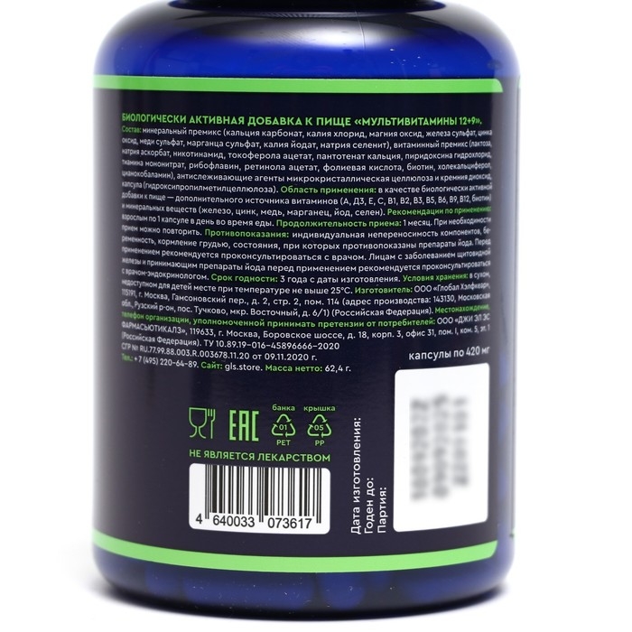 Мультивитамины "12+9" GLS - это полноценный мультивитаминно-минеральный комплекс для поддержания здоровья взрослых, содержащий 12 витаминов и 9 минеральных веществ.