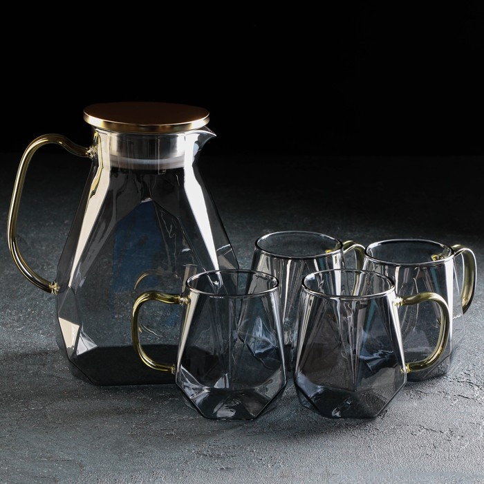 Набор питьевой включает в себя 5 предметов: кувшин и четыре кружки. Предметы изготовлены из качественного прочного стекла с покрытием. Кувшин с металлической крышкой, в которой есть фильтр. Изделия имеют эргономичные ручки, кувшин оснащён удобным носиком.
