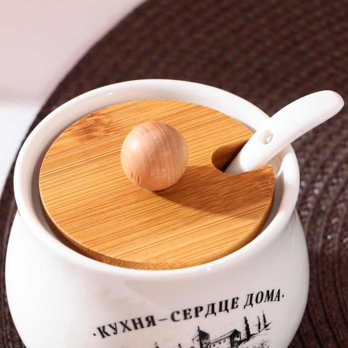 Сахарница керамическая с деревянной подставкой «Сердце дома», 230 мл, цвет белый