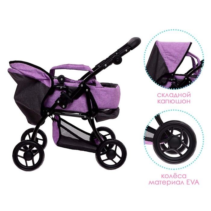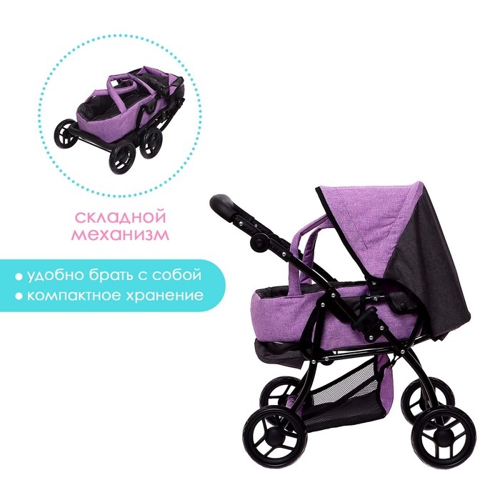- Коляска складывается и занимает мало места. Корзина в комплекте будет служить местом хранения для всех необходимых вещей ребёнка и его пупса.