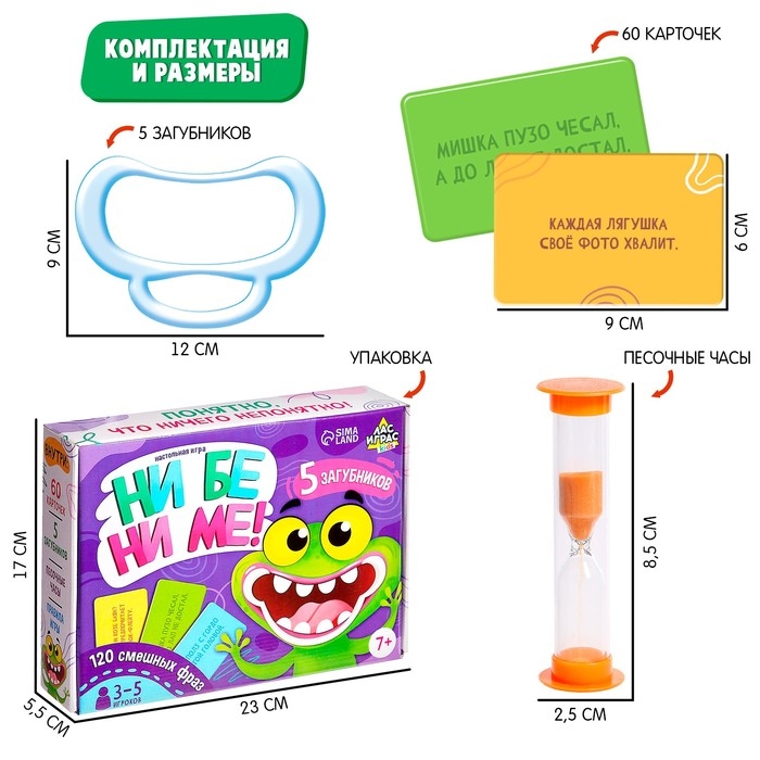 Докажите друзьям, что вы самый внимательный слушатель! В настольной игре «Ни бе ни ме!» ваш соперник с загубником во рту будет проговаривать слова со своей карточки, а вам нужно слушать и высказывать предположения, чтобы догадаться, что же он хотел сказать. Проявите всю свою внимательность, чтобы победить!