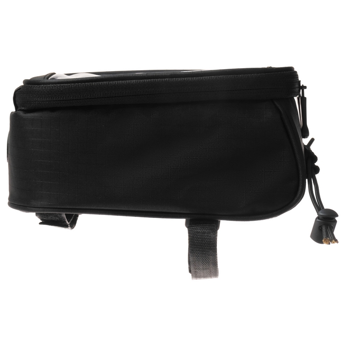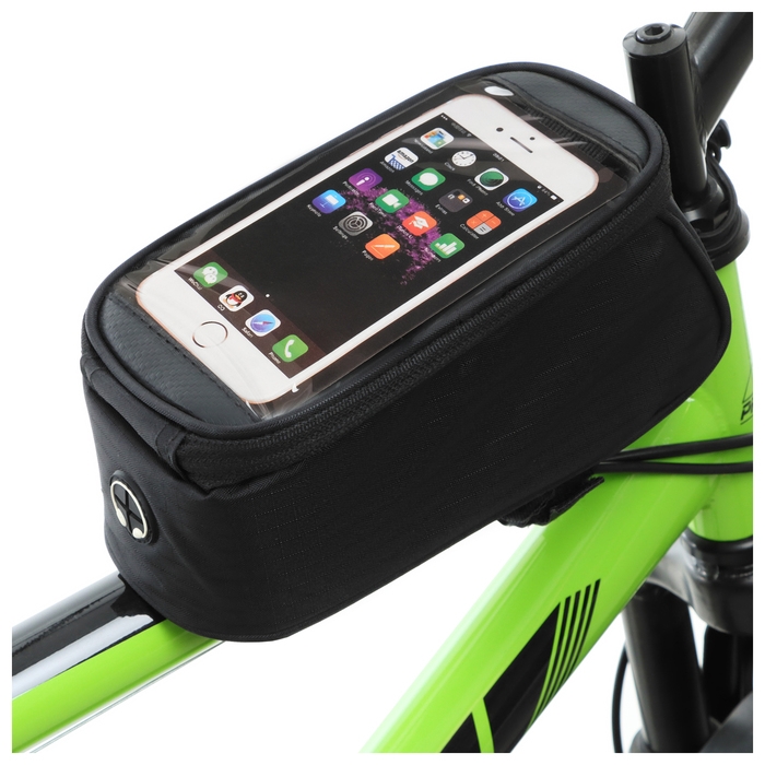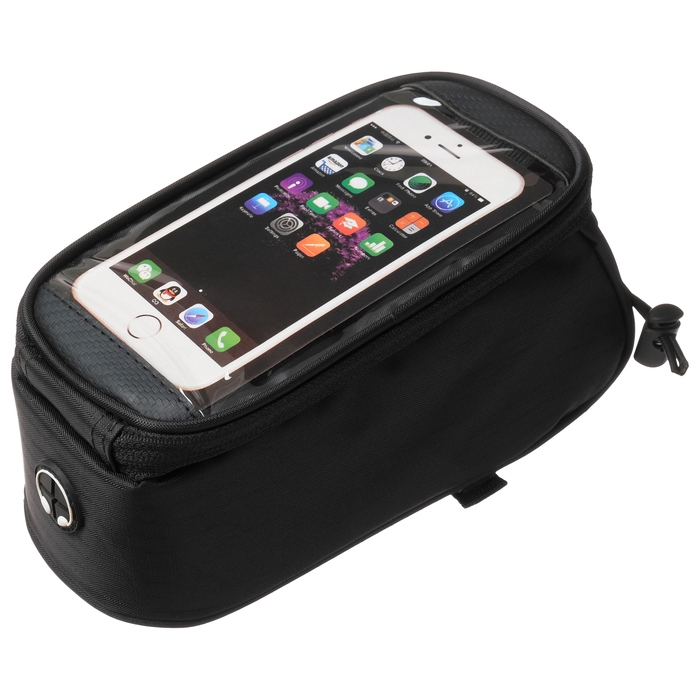 Велосумка крепиться на раму велосипеда. Имеет один отсек на молнии и дополнительный отсек под телефон с прозрачной крышкой.