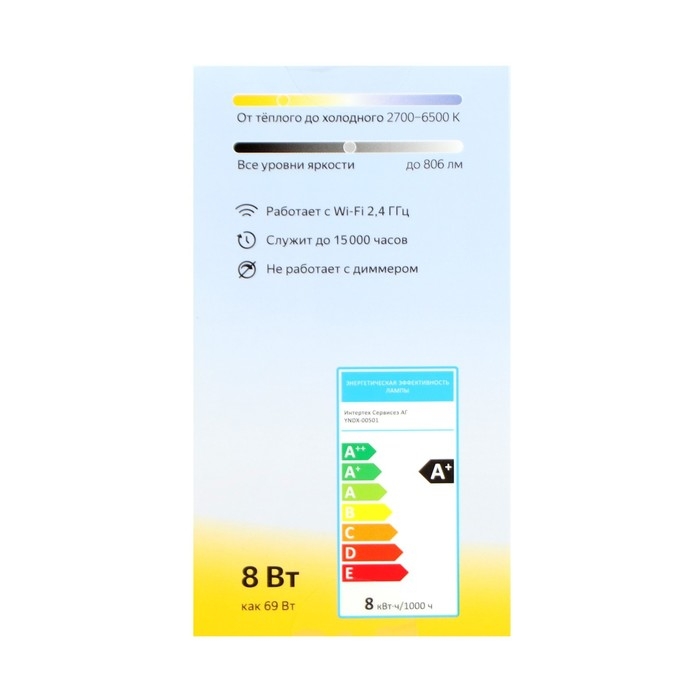 Умная светодиодная лампа Яндекс с цоколем E27 и привычной формой шара подходит для большинства люстр. Светодиоды сохраняют работоспособность в течение 15000 ч работы и экономично потребляют электроэнергию. По яркости устройство заменяет лампу накаливания мощностью 75 Вт. Яндекс YNDX-00501 подходит для работы в экосистеме умного дома с Алисой и простым подключением по Wi-Fi. Вы можете менять яркость и цветовую температуру, настраивать расписание по времени и дням недели, включать таймер включения и отключения. Мобильное приложение Яндекс или Умный дом с Алисой помогает создавать индивидуальные сценарии поведения совместно с другими умными устройствами.