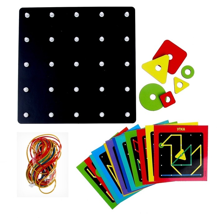 Геоборд — это специальная доска для конструирования различных изображений с помощью равноудалённых друг от друга штырьков и резиночек. Их малышу предстоит нанизывать на выпуклые элементы и создавать таким образом разнообразные фигуры.