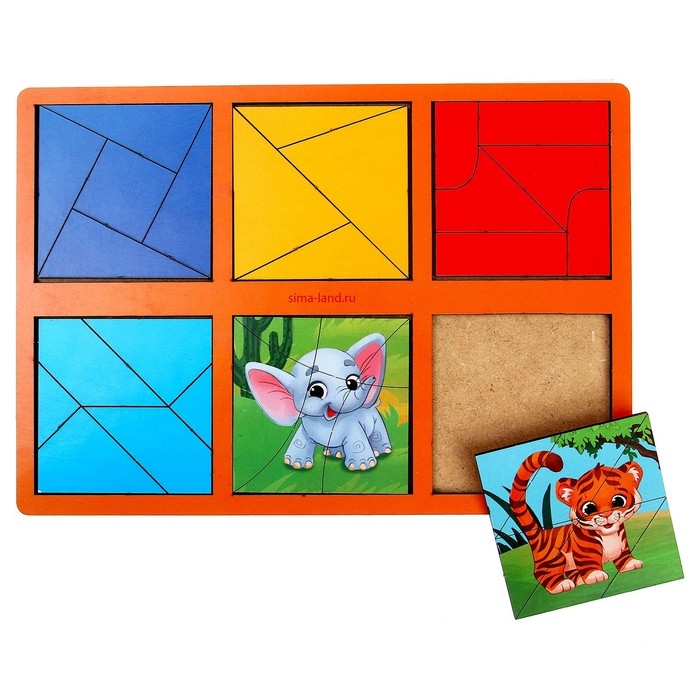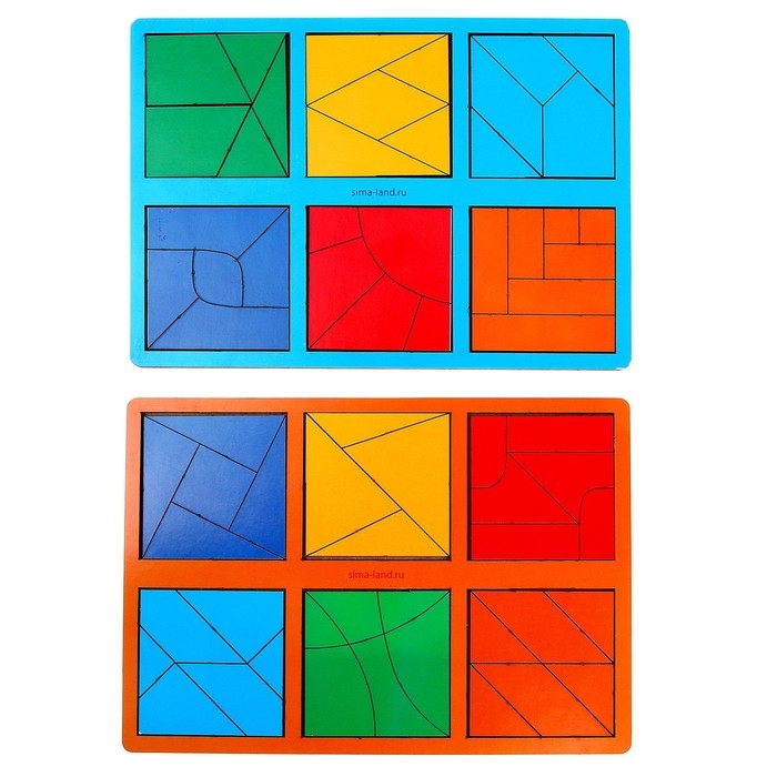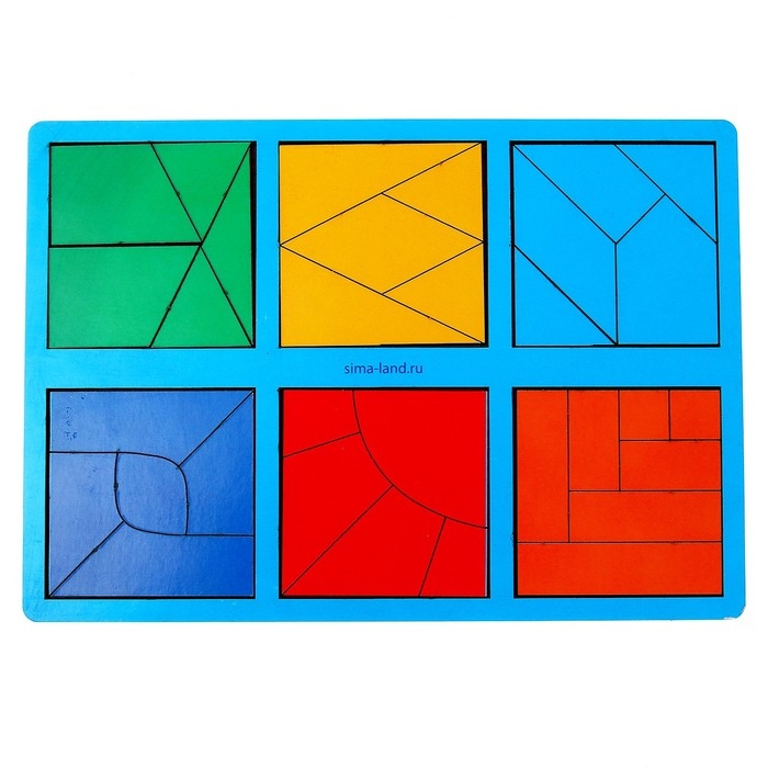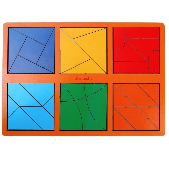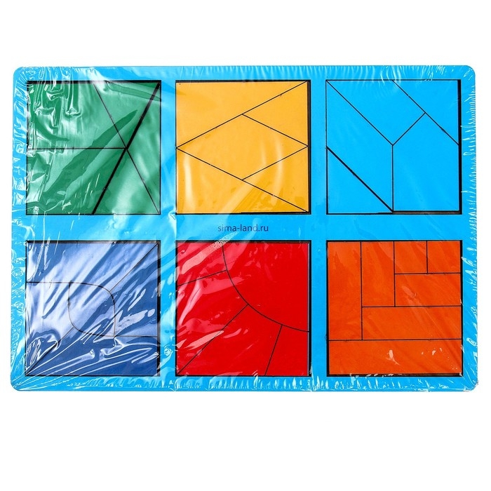 Задача малыша - собрать 6 квадратов из цветных элементов: треугольников, прямоугольников и других фигур.