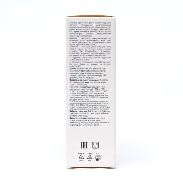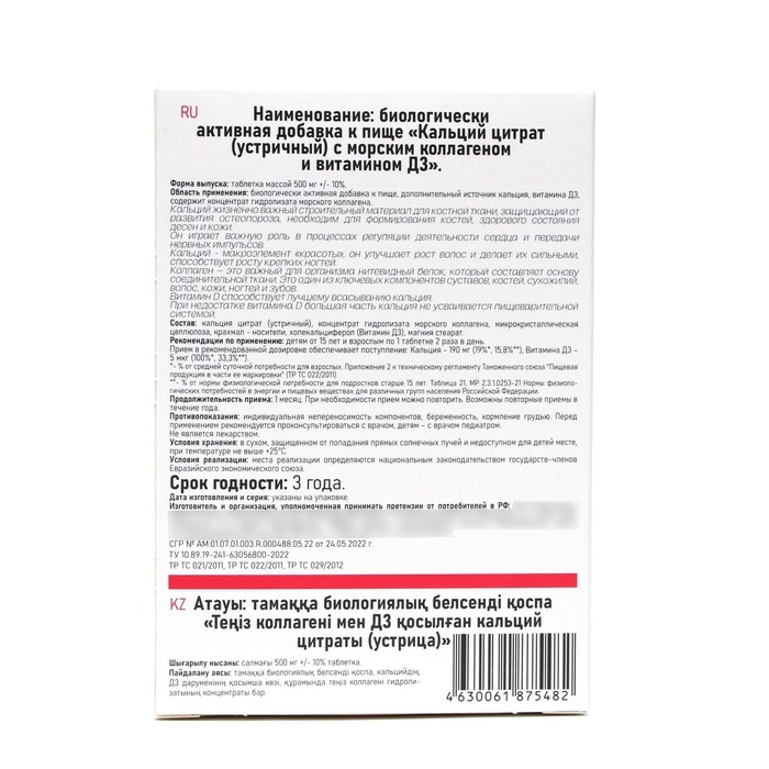 Состав: Кальция цитрат (устричный), концентрат гидролизата морского коллагена, микрокристаллическая целлюлоза, крахмал - носители, холекальциферол (Витамин Д3), магния стеарат.