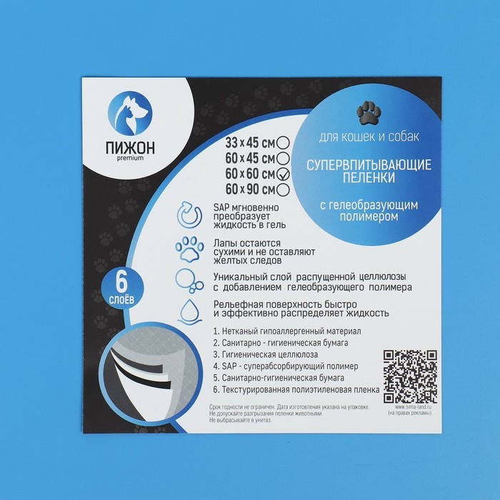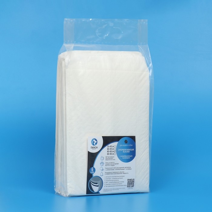 Пеленки для животных шестислойные гелевые, 60 х 60 см, (в наборе 30 шт)